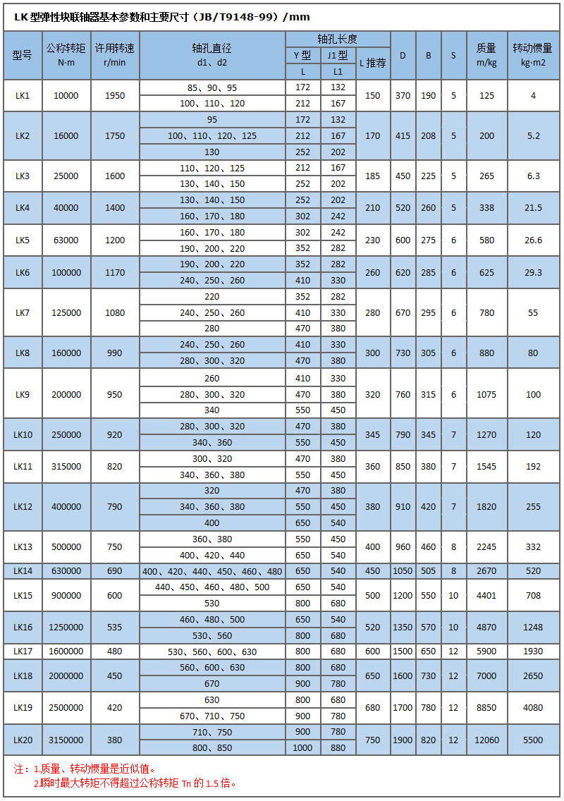 LK彈性塊聯(lián)軸器 是以橡膠為彈性元件材料,無扭轉(zhuǎn)傳動間隙,易于現(xiàn)場調(diào)節(jié)剛度的彈性聯(lián)軸器,具有補償兩軸相對偏移以及減振、緩沖性能,節(jié)能,無噪聲,不用潤滑,更換彈性件(易損件)時主機半聯(lián)軸器用作軸線移動(對于重型機械設(shè)備此特點尤為重要),安裝維護簡便,使用壽命較長,根據(jù)需要通過改變橡膠配方(主要改變硬度)可以調(diào)整聯(lián)軸器的扭轉(zhuǎn)剛度。適用于聯(lián)接兩同軸線大中功率、振動沖擊較大的軸系傳動,例如冶金機械、礦山機械等。原來的標(biāo)準(zhǔn)(ZBJ19029-90)存在外徑尺寸大、質(zhì)量大等缺點,改進后的新標(biāo)準(zhǔn)(JB/T9148-99代替ZBJ19029-90)新結(jié)構(gòu)不僅保留了減振、緩沖性能好的特點,而且縮小了外徑尺寸,減輕了質(zhì)量和轉(zhuǎn)動慣量,提高了許用轉(zhuǎn)速,經(jīng)過幾年的工業(yè)應(yīng)用,優(yōu)點十分明顯,已成原結(jié)構(gòu)的更新?lián)Q代產(chǎn)品。新標(biāo)準(zhǔn)許用轉(zhuǎn)速平均提高28%,大外徑平均縮小36%,轉(zhuǎn)動慣量平均減小70%,質(zhì)量平均減輕57%。